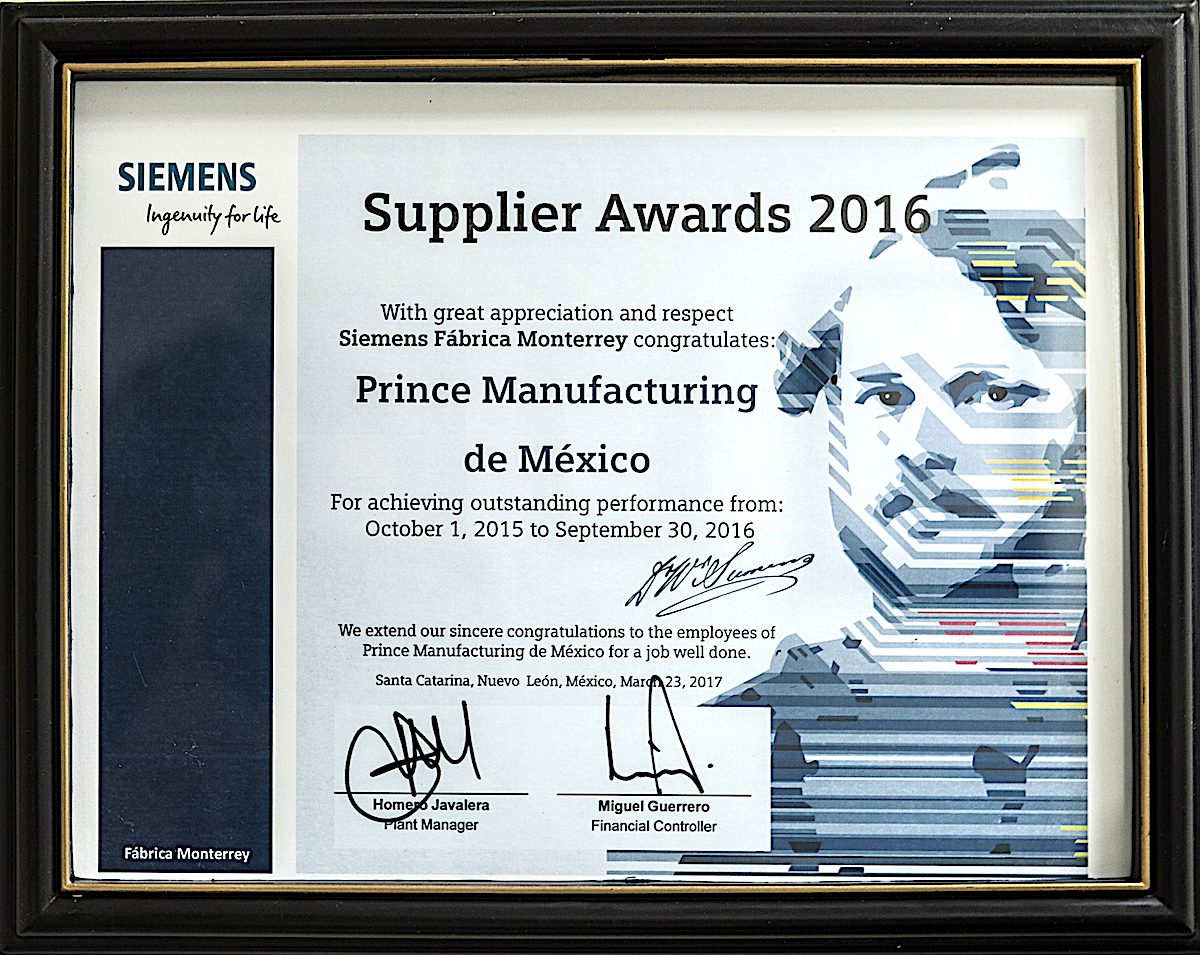 With great appreciation and respect, Siemens Fabrica Monterrey Congratulates Prince Manufacturing de Mexico for achieving outstanding performance.